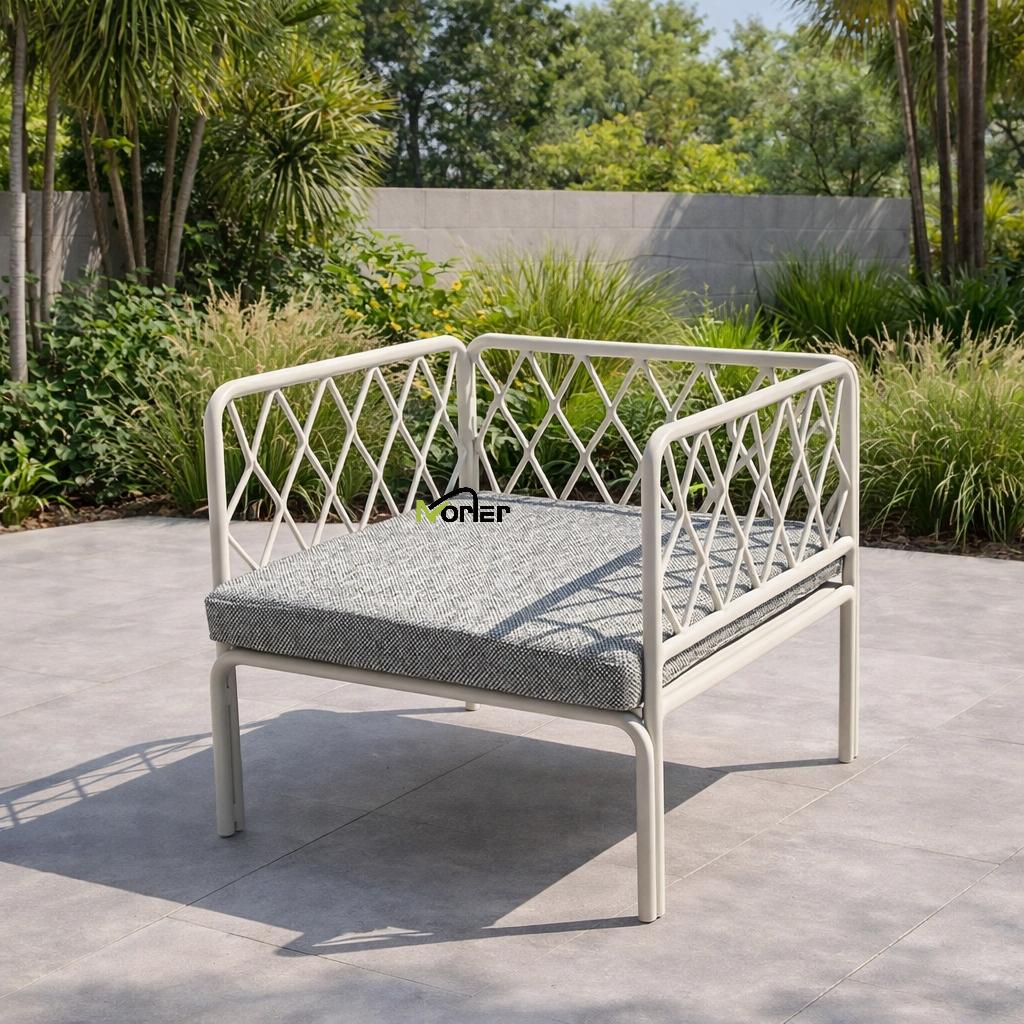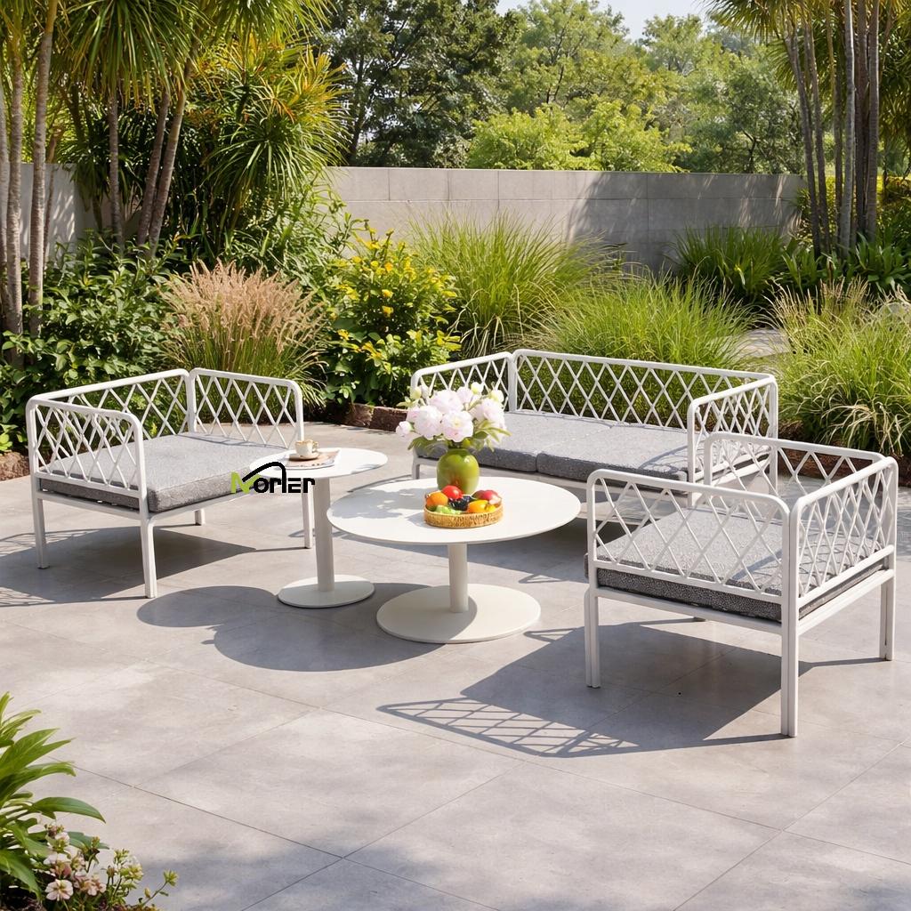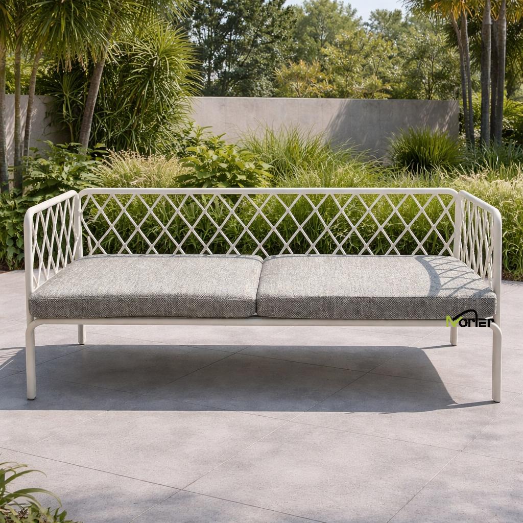 Set sofa luaran moden ini menampilkan reka bentuk yang bersih dan minimum dengan bingkai logam geometri yang direka dengan cantik. Struktur kekisi terbuka mencipta penampilan yang ringan dan elegan sambil mengekalkan sokongan struktur yang kuat.